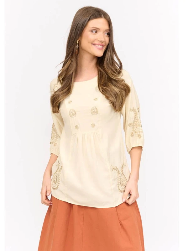 חולצה בגוון שמנת, גזרת עטלף ובד רקום