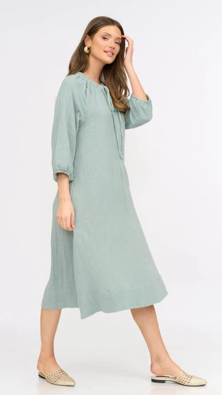 שמלת קיץ קלילה ומרעננת מבד טטרה 100% כותנה. גזרת A רחבה ומאווררת עם שרוולי 3/4 בגימור גומי עדין, סגירה רכה עם קשירה בצווארון שיוצרת מראה נשי ונינוח. יש רוכסן קידמי.