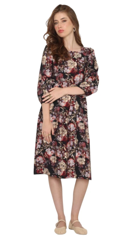 שמלת שרוכים בגב מודפס שחור