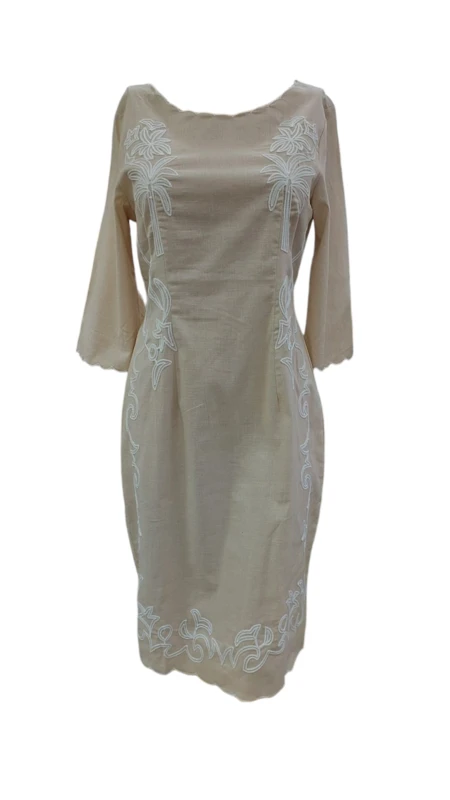 שמלה בצבע בז, גזרה ישרה עם רקמות לבנות.