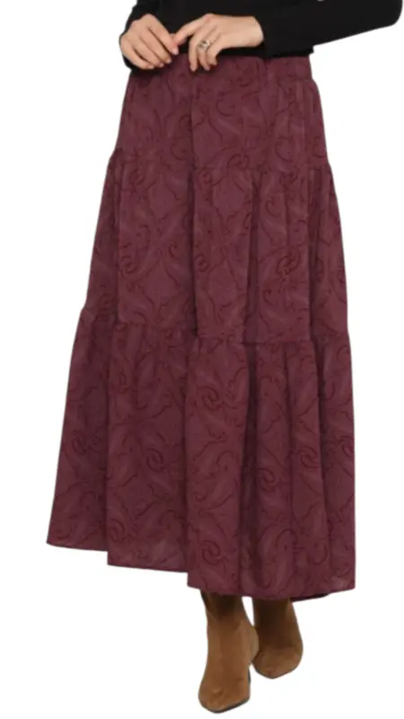חצאית קומות מבד מקומט עם דפוס עדין, בגזרה נשפכת ונשית, מעניקה מראה קליל, ואלגנטי.