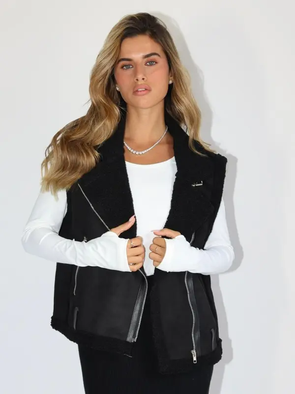 אפודה עם צמר נעים מבפנים, ובד דמוי עור מבחוץ, עם כיסים ורוכסן.