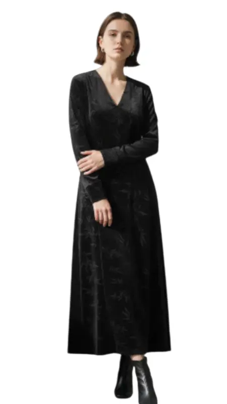 שמלת חורף מבד קטיפה צרובה עם ביטנה, בגיזרה ישרה ומשוחררת, פתח צוואר בצורת וי, מצורפת חגורה, ובד צווארון נשפך נפרד שסוגר גם את מפתח הצוואר.