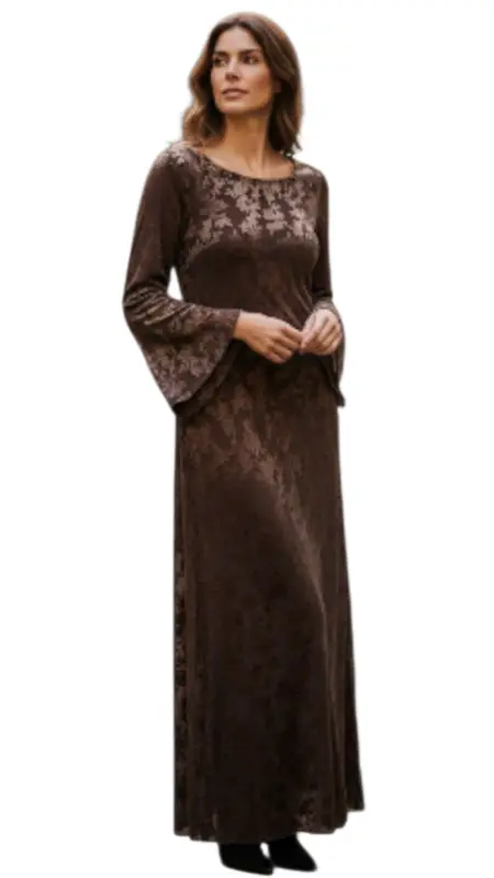 שמלת מקסי מבד של קטיפה צרובה, מפתח עגול, שרוולי פעמון וסגירת רוכסן בצד.