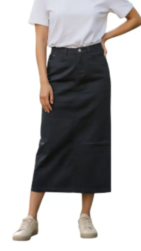 חצאית שחורה מבד קשיח עם כיסים בגיזרה ישרה.