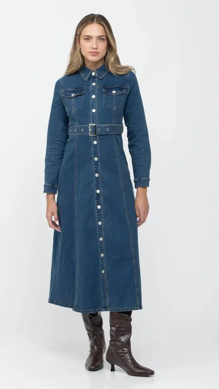 שמלת ג׳ינס כחולה באורך מקסי עם רקמת לוגו
