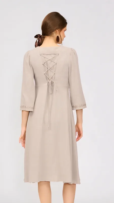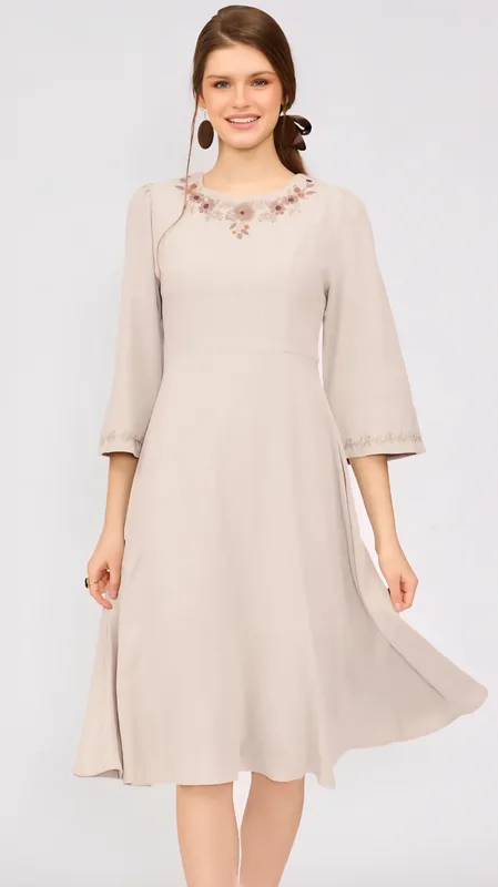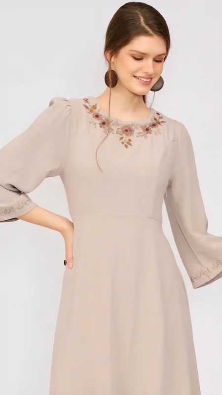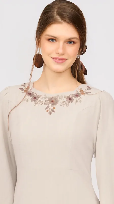 עם רקמות עדינות המעטרות את המפתח, ואת הסיומת המתרחבת בשרוול