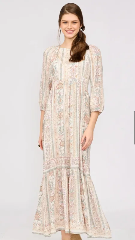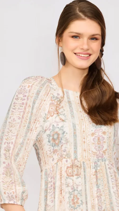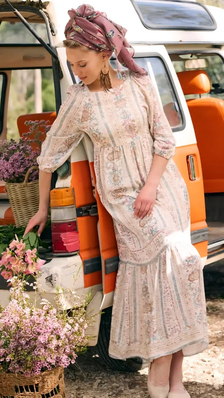 שמלת מידי בגזרת מעטפת מחמיאה עם קשירה בצידי המותן המעניקה טאץ’ נשי ומוקפד.השמלה מעוטרת בהדפס פרחים עדיניםהיא בעלת מפתח צוואר עגול, ושרוולים ארוכים עם סיומת גומי.