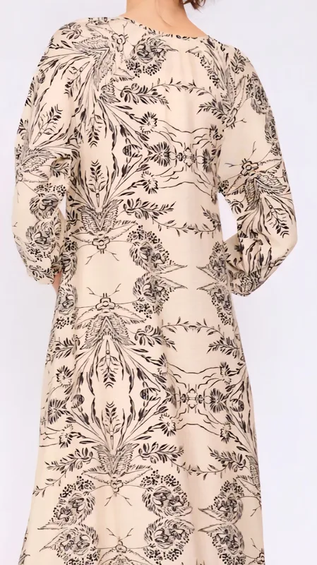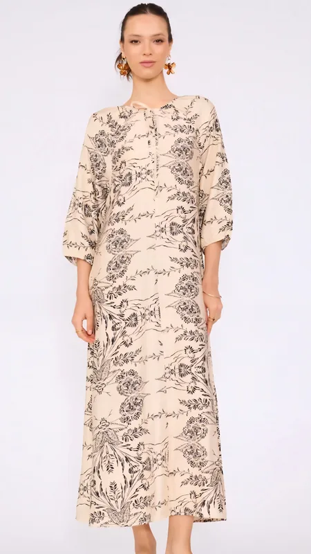 שמלת מקסי נינוחה וזורמת עם הדפס איורי פרחים עדין וייחודי