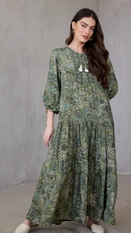שמלת מקסי ארוכה עם בד מתנפנף בגזרה נשפכת ומחמיאה.