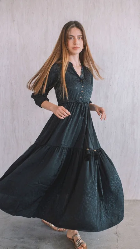 שמלת מקסי זורמת עם שרוול 3/4 וכפתורים נפתחים בחזית, שמתאימים גם להנקה.