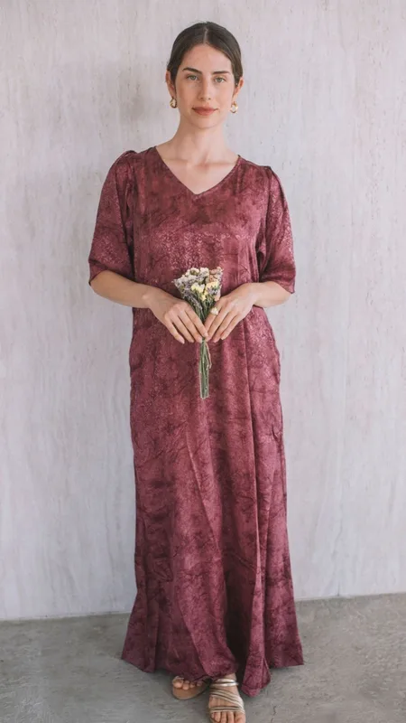 הבד בגוון ורד המדבר — שילוב עמוק של ורוד, בורדו וסגול — עם הדפס פרחוני עדין שמעניק לשמלה מראה רך, נשי ומלא נוכחות.